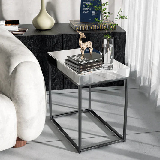 Silver Glass Mirrored Sofa Side Table Nightstand Table with Open Shelf